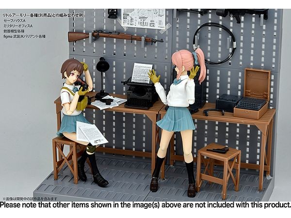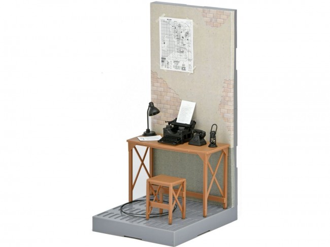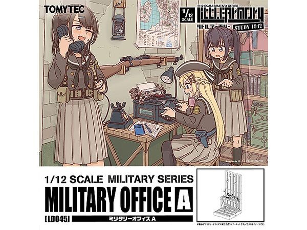 This scene set combines office supplies used in Europe and the United States in the 1940s. The set includes a wooden desk, chair, black telephone, desk lamp, typewriter, lanterns used by the German army, and other small items on the base floor and walls. The set is also recommended for dollhouse-style enjoyment as a precision model with a vintage look. Little Armory", the well-known 1/12 scale plastic model of modern firearms with a girl in uniform, has launched the "STUDY1942" series to reproduce various firearms that were developed by the World War II period and became the foundation of modern firearms. This time, "Military Office", a scenic item that is easy to match with guns of the 1942 series, appears. The vintage typewriter is partially movable. The vintage typewriter is partially movable and can be placed with the included paper craft for a more realistic look. The desk lamp is also partially movable. The retro European-style black telephone receiver is a separate part and can be removed. The lantern used by the German army. The handle is movable. Can be connected to other parts of the Gun Rack series. Can be connected with the separately sold Gun Rack series. Box art is newly drawn by Botchanai. LittleArmory Military Office A specification: 1/12 scale Runner assembly kit Made of PS resin Product Size External dimensions of product: approx. W10 x D11 x H21.5cm Set Contents Floor×1 Wall×2 Hooks x 10 Triple hooks x 4 Joint parts×5 Wall/floor connecting parts×1 Desk×1 Chair×1 Black phone x 1 Desk lamp×1 Lantern × 1 Vintage typewriter × 1 Vintage typewriter × 1 Wall sticker×1 Paper craft (documents & map) *All photos are prototypes. They may differ from the product. *Product specifications are subject to change without notice. (From Tomytec website)