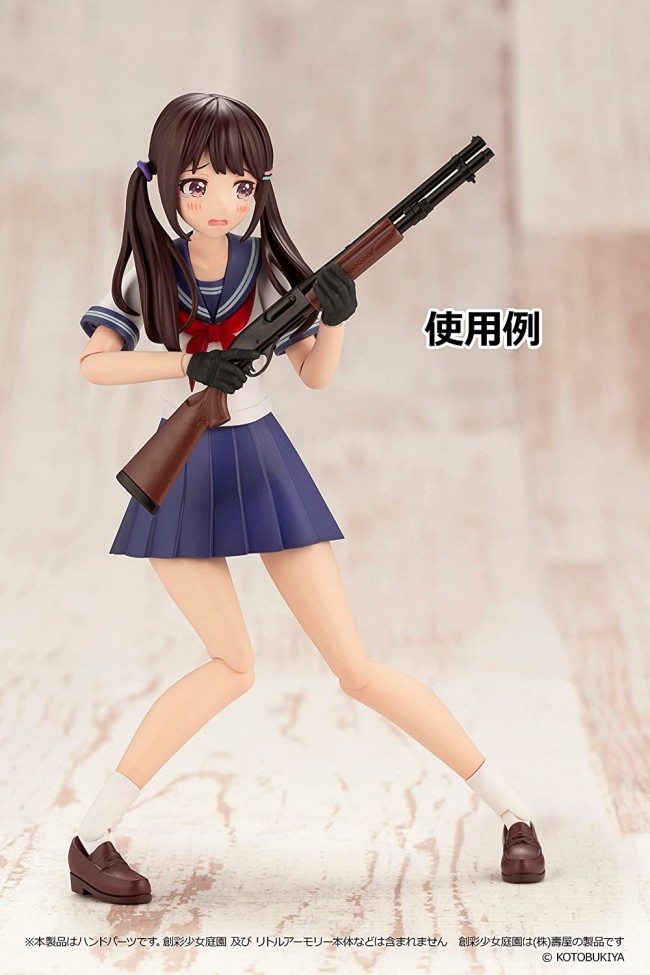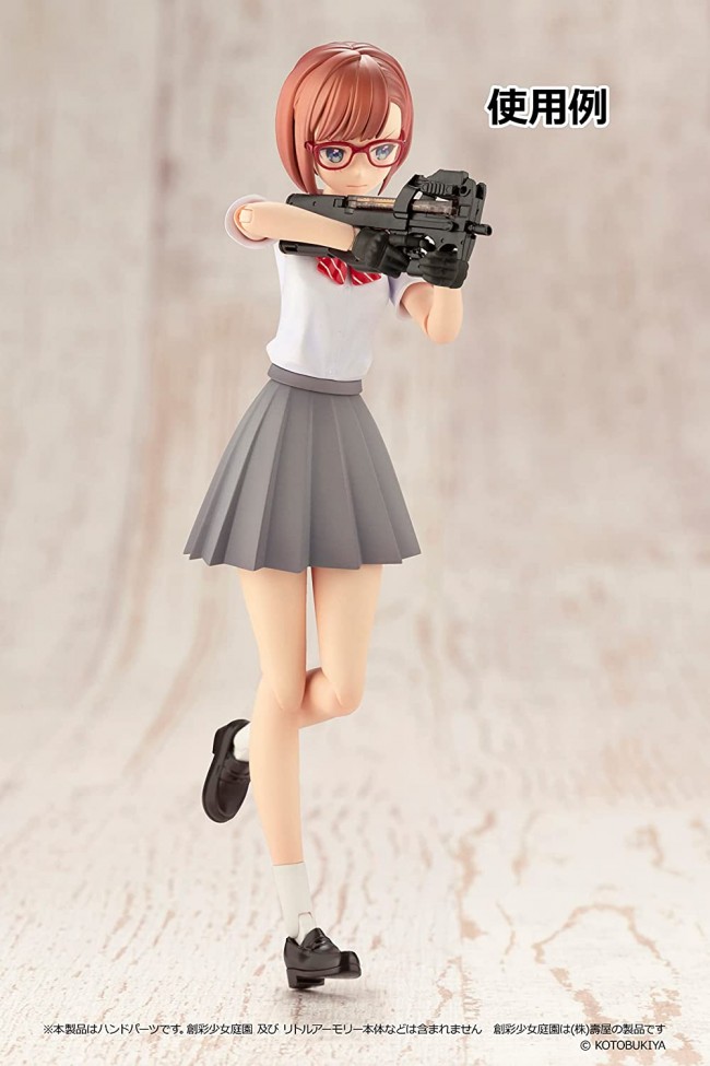 This is the second hand parts set to let "Sosai Shoujo Teien" have "Little Armory"! This work is sculpted for pistols, old rifles, and P90 types that were difficult to deal with in the previous products, such as the left and right integrated hands that reproduce the difficult-to-pose "pistol in both hands" and hands holding grips with collapsed angles. When combined with the previous model, it is possible to have quite a variety of guns. Includes 2 pistols. Includes Python Magnum PPC custom type. Joint parts included in Sosai Shoujo Teien can also be used. LittleArmory Tactical Glove 2 Revolver Set (Black) for Sosai Shoujo Teien: Specifications Tactical gloves x 6 Cardigan sleeves x 6 Handgun x 2 Fixed joints x 10 PS/PVC runner kit (uncolored) *Figures and guns other than the product are not included. Photos are for illustrative purposes only. *All photos are prototypes. They may differ from the product. *Product specifications are subject to change without notice. *Because there are various shapes of Little Armory firearms models, some models may not be compatible with this product. Please understand this beforehand. *This product is a hand part. Sosai Shoujo Teien and Little Armory are not included. Sosai Shoujo Teien is a product of Kotobukiya Co. (C) KOTOBUKIYA Distributed by TOMYTEC Co. (From Tomytec's website)