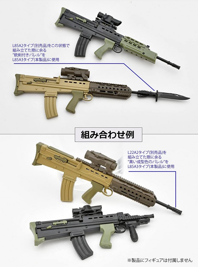 Plastic model/runner kit (Colorless) [Scale] 1/12 [Size] Approx. 6.5cm in length [Material] Resin (PS) [Other] Molding colors: Tan, Earth, Dark Earth The British-made SA80 automatic rifle is a bullpup-type 5.56mm rifle with a long barrel but a short overall length, and has been deployed in the British Army under the name L85A1 since 1985. Since then, it has been battle-proofed and upgraded, with the current model, the A3 type, becoming official in 2018. The main features of the Type A3 are the adoption of a lightweight Hkey hole-type handguard and a low-visibility color. Accessories have been updated in parallel, with the Type A3 often paired with the new Laser Light Module Mk3 and the rugged Canadian-made OS4 4x magnification scope. This product is a 1/12 scale kit of the L85A3 using three molding colors. It can be converted to [LA071] L85A2/L22 type (sold separately) to enjoy further changes. Recommended to use adhesives for plastic models.