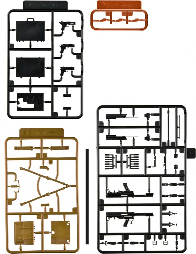 Weapon from the original TV animation "Licorice Recoil" is modeled in ultra-precise 1/12 scale plastic model. Included in assembled runner parts such as handgun, long gun, and bag for concealment carry. In addition, a postcard-sized character card is included. Enjoy building the model, displaying the character cards and the model side by side, or combining it with figma to be released by Max Factory at ...... in various ways! [Set includes] Includes runner parts for Senzoku's handgun, hard case for the handgun, shotgun and licorice bag. The bag is made of soft plastic and can hold the handgun. The handgun comes in three shapes, including slide retracted and hammer cocked. The gun case can be opened and closed to hold the handgun. The shotgun can be moved back and forth at the fore-end. The bag is made of soft plastic and can hold a handgun. Compatible with figma prop. Character card (postcard size: color printing on both sides) Licorice Recoil Weapons - Senzoku ver. specification: 1/12 scale Runner Kit (Colorless) Made of resin (PS) *Recommended to use adhesives for plastic models Product Size Shotgun Length: approx. 5.5cm / Handgun Length: approx. 2cm Planning cooperation Max Factory Co. Tokyo Marui Co. (C) Spider Lily / Aniplex, ABC Animation, BS11 *All photos are prototypes. They may differ from the product. *Product specifications are subject to change without notice. Released/Distributed by TOMYTEC Co. (From the TOMYTEC website)