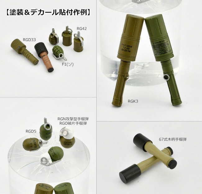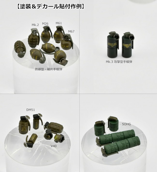 1/12 scale reproduction of 30 types of grenades from the old and the new. Basic fragmentation grenades, gas bombs, stun grenades...etc. Most of them are molded in one piece and can be easily used for figure play, while others can be painted or finished with the included decals for a more detailed and precise miniature. The instruction manual includes painting diagrams and explanations! Paint and marking diagrams can also be downloaded (PDF) from https://www.littlearmory.jp/pdf/ld046.pdf. Includes decals for the German hand grenade markings included with the [LA097] P08 & 38 type (sold separately). Please combine with 1/12 scale movable figures. Figures are not included. The box art is newly drawn by Samaru! LittleArmory Hand Grenade Set Specifications: 1/12 scale Runner assembly kit Made of PS resin Product size: Total length approx. 0.5 - 2cm each About Grenades Hand-thrown small bombs = hand grenades are one of the basic equipment for infantrymen. It is simple, reliable, and inexpensive. In addition to being thrown by hand, they can also be used in a variety of operational methods, such as being sent flying with a launcher or used as a trap. Since its basic structure as a weapon was established in the WW1 period, all kinds of models have been made in various countries around the world. *All photos are prototypes. They may differ from the product. *Product specifications are subject to change without notice. Released/Distributed by TOMYTEC Co. (From Tomytec website)