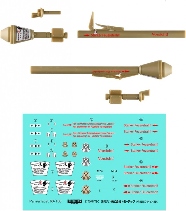 Reproduction of the range 60m and 100m types that were widely used during the Panzerfaust series. It is reproduced as a set of two guns with decals included in the dark yellow molding color. Little Armory [LA099] Panzerfaust 60/100 type Specifications: 1/12 scale Runner kit (uncolored) Made of resin (PS) *Recommended to use adhesives for plastic models Product size Length approx. 9cm About Panzerfaust 60/100 type The Panzerfaust is a disposable anti-tank firearm developed in Germany during WW2. Its name means "tank fist" in German. It was produced and operated in large numbers until the end of the war because of its simple structure, excellent productivity, easy operation, and power to destroy Allied tanks of the time. *All photos are prototypes. They may differ from the product. *Product specifications are subject to change without notice. *Released/Distributed by TOMYTEC Co. (From Tomytec website)