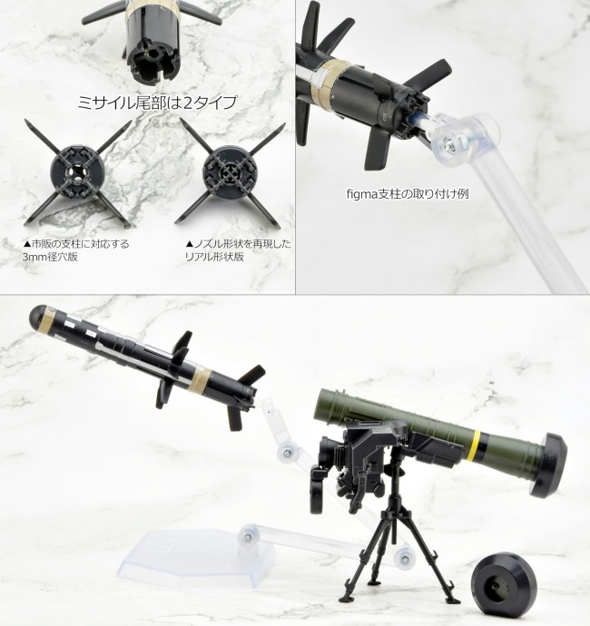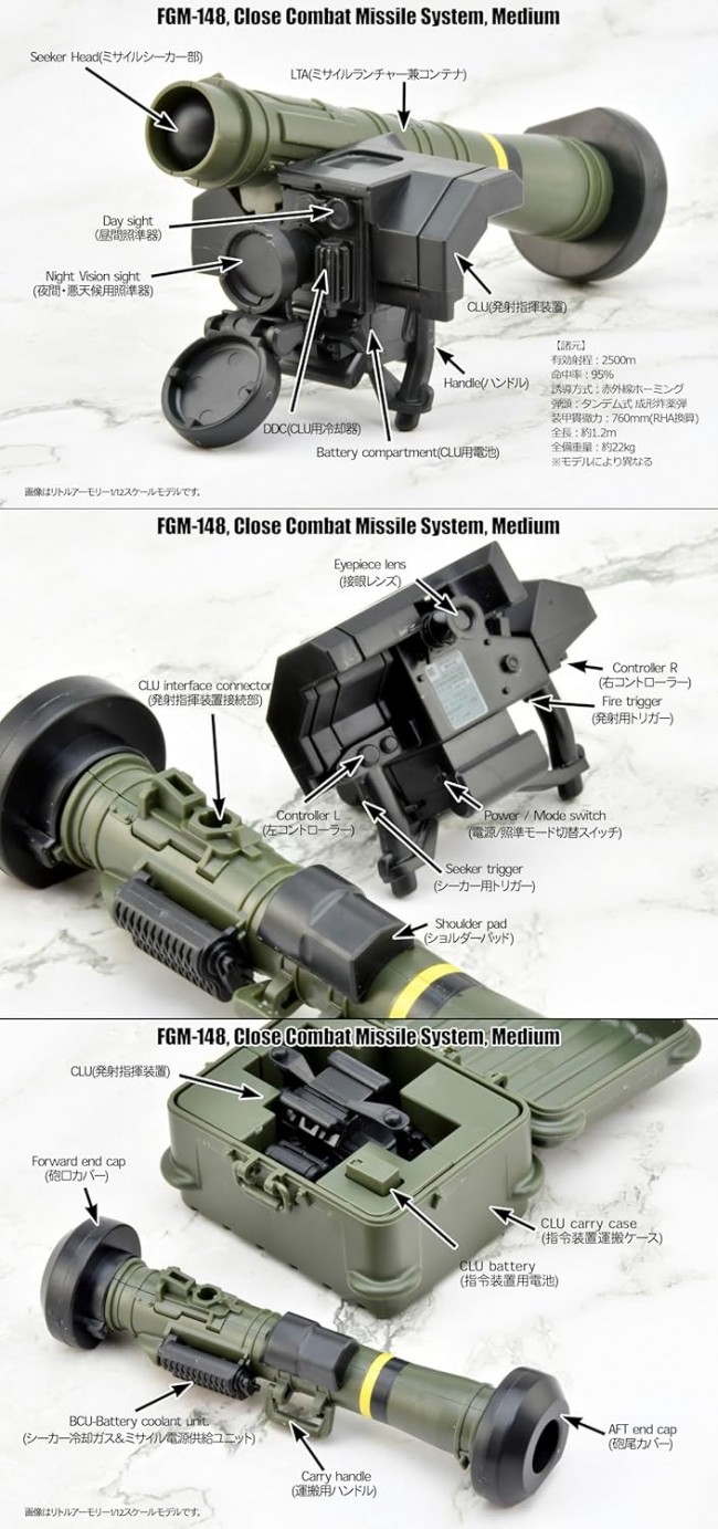 Precise 1/12 scale reproduction of the most powerful anti-tank missile. The firing sequence can be reproduced by attaching and detaching the sighting device and muzzle cover. A tripod part to make it a fixed gun is also newly prepared. The included decals can be used for a more realistic finish. The product is designed for both display and action. Marking illustration material>>chrome-extension://effaidnbmnnnibpcajpcglclefindmkaj/https://www.littlearmory.jp/pdf/la103.pdf Two types of CLU (targeting device) can be selected from U.S. and British military types. Figma props can be attached to the missile tail (3mm shaft diameter). Various markings and decals are included to create a realistic model. Can be combined with 1/12 scale movable figures. *Figures are not included. The FGM-148 Javelin is a hand-held anti-tank missile system developed in the United States. Its greatest feature, the “leave-fire” function, allows the shooter to lock on to a target and immediately take evasive action after firing. Compared to older anti-tank missiles, which required guidance maneuvers until impact, this system has dramatically improved the survivability of the shooter. Furthermore, the missile is equipped with a “Top Attack Mode” that launches the missile high to target thin upper surface armor, boasting an attack power that can destroy heavily armored tanks. The Javelin has been widely adopted by NATO countries and has become a renowned anti-tank missile system that is battle-proof and a “symbol of modern warfare. LittleArmory FGM148 type anti-tank missile Specifications: 1/12 scale Runner Kit (Colorless) Resin (PS) Recommended to use adhesives for plastic models. Product size Length: approx. 10cm *All photos are prototypes. They may differ from the product. *Product specifications are subject to change without notice. Released/Distributed by TOMYTEC Co. (From the Tomytec website)