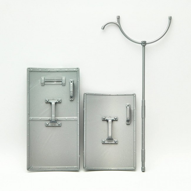A shield made of duralumin, a type of aluminum alloy, which symbolizes the Japanese riot police. It weighs about 5.4 kg. The purpose is to protect against beatings by stones and blunt instruments. In this kit, we have reproduced a large area "large shield" that emphasizes protection and a "small shield" that emphasizes mobility and is easy to handle. We also manufacture the characteristic back handle.