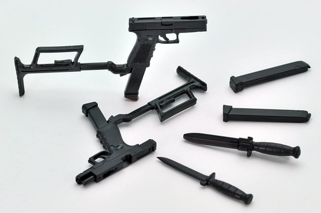 The kit reproduces the slide forward and backward states respectively. The 18C is equipped with stock and a long magazine, and the port on the slide is also reproduced. Two types, 17-series mug and 33-series mug, field knife and sheath are included.