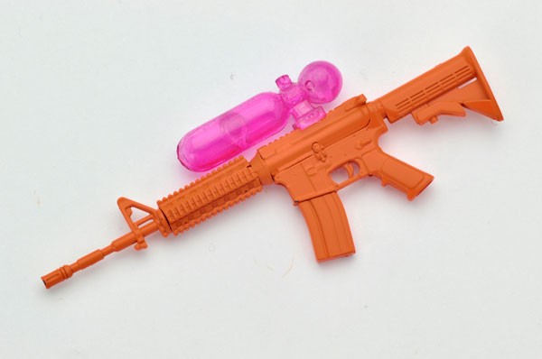 The water gun that imitates the popular carbine rifle M4 can be selected from a magazine type bottle and a rail installation type bottle.