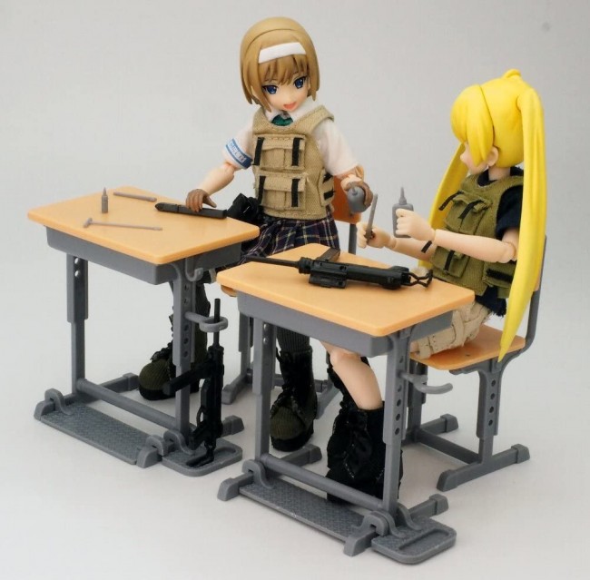 The desk used at the designated defense school has been devised so that the firearms used in class can be leaned against it. It is also ideal for reproducing the classroom that appears in the Little Armory novel version.