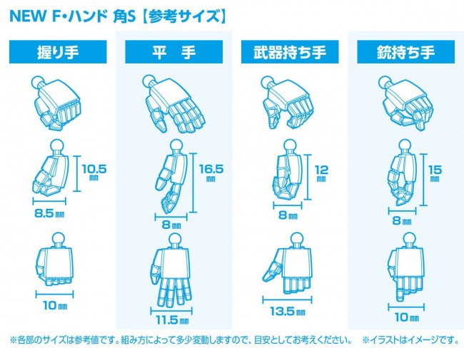 A versatile angular-finger type with moderate detail ・Assembly-type hand parts useful for detailing 13-15cm robot models. ・A simple yet versatile angular-finger type with moderate detail. ・Realistic sculpting not found in articulated fingers. Moderate part segmentation balances ease of assembly with shape reproduction. ・Available in two sizes: S and M. ・Available in two colors: Gray and White. 【Important Notes】 ・This product is an 【Advanced User】 model requiring gluing and modification. ・Use commercially available [plastic model adhesive] or [instant adhesive] for assembly. ・Modify and adjust the base of each wrist to fit your kit. ・Modify and adjust the [Weapon-holding Hand] and [Gun-holding Hand] to fit the specific parts and grips you are using. NEW F・Hand Square S White ■Option System Series ■Plastic Model Kit ■Requires adhesive (sold separately) ■Set Contents: [Closed Hand], [Flat Hand], [Weapon-holding Hand], [Gun-holding Hand] - 1 set each for left and right ■Product Material: PS ■Product Code: OP-762 (White) ※All sizes are approximate. Slight variations may occur. ※Images are of a development sample. Actual product may differ. Please note. ※Tools, materials, and parts other than the product shown in the explanatory photos are not included. (From Wave Website)