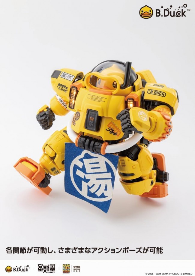 A powered suit in which an adorable duck becomes the pilot! This is a powered suit in which an adorable duck becomes the pilot. The rounded form of this mechanical model is cute as it is, but each part of the suit is well-detailed. The large 22 cm tall figure is a real treat to build, and features various gimmicks such as movable parts and a pilot duckling that can be boarded. An LED unit is built in, and some parts can be made to glow. ABS plastic model kit NON-scale (overall height: approx. 220mm) Snap-fit type with no adhesive required Product material: ABS, magnet, etc., cloth Accessories: pilot duckling (B.DUCK), stickers, decals, LED unit (batteries sold separately / uses 4 LR521 type batteries and 8 LR41 type batteries) Manufacturer: SOSKILL Import and sales agency : WAVE Co. Product code: KM-137 *The image is under development. The detailed specifications may differ from the actual product. Please understand. (c)2005,2025 semk products limited This product is planned and manufactured by SOSKILL and imported and sold by WAVE Co. (From Wave website)