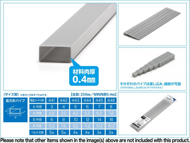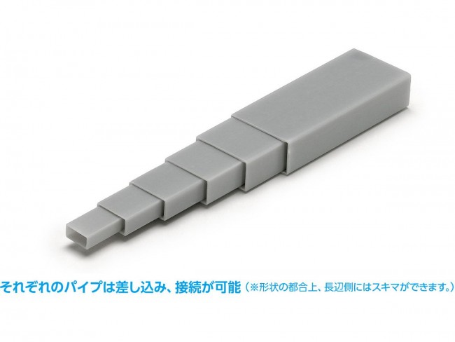 A new pipe with a special shape is now available in the plastic material series! A product with a slightly different shape is now available in the popular Plastic Pipe Series. Made of plastic (PS) just like general plastic models. It is useful for detailing and creating original parts. Pipes can be connected to each other to expand the range of your crafting. (*There will be a gap on the long side due to the shape.) [Caution] Size error may occur due to the shape. Sawing tools are recommended for cutting materials. (Inserting a core material or the like inside will suppress deformation of the material and make it easier to cut.) Plastic = Material [Gray] Rectangular pipe ■Total 6 types ■Material wall thickness: 0.4mm (common) ■Total length: 250mm (common) ■Product material: Styrene resin/PS ■Product code OM-441 (3 x 6mm) (From Wave website)