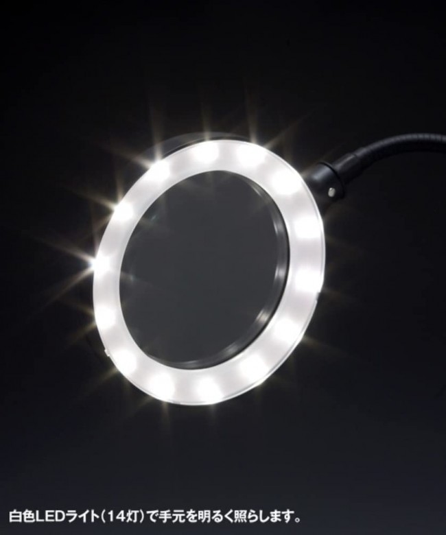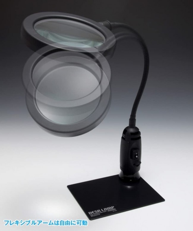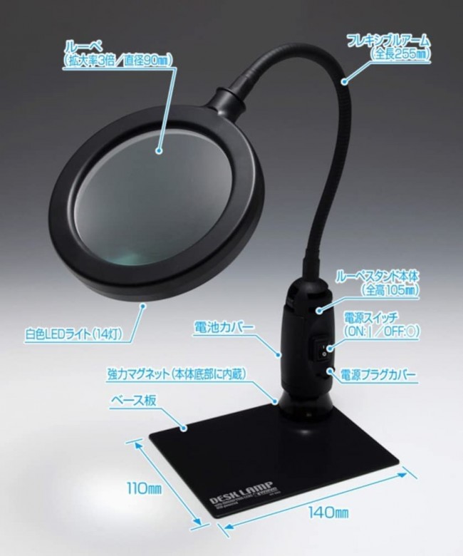 Modeling / Modeling Aids, etc. A strong ally for precision work! This is a loupe stand with a USB-powered LED light. This is a loupe stand with 14 white LED lights for hand-held illumination. Magnification: 3x (diameter 90mm). The flexible arm can be moved freely and is useful for various modeling tasks such as assembling small parts and coloring fine details. Strong magnets are placed on the bottom of the main unit, allowing it to be attached to the included base plate or a commercially available steel workbench. The power source can be selected from two types: USB power supply or battery. Compatible power supply 1)USB AC adapter DC5V, 1.0/2.0A both types can be used. AC adapter is not included with this product. Please prepare separately an AC adapter for charging smartphones, cell phones, etc. or an AC adapter with a commercially available USB connection. 2) 2 AAA alkaline batteries *Rechargeable batteries cannot be used. Loupe Stand [with LED light] USB power supply type ■Body size: approx. 250 x 180 x 260 mm *Standard installation condition when the base plate is used ■Weight: Approx. 700g (*including base plate) ■Product materials Main unit: ABS Lens: Acrylic Flexible arm / Base plate: Iron Loupe protective bag: Nylon Accessories: USB cable (for power supply / cable length 1.0m) / Loupe protection bag AC adapter is not included in this product. (From Wave website)