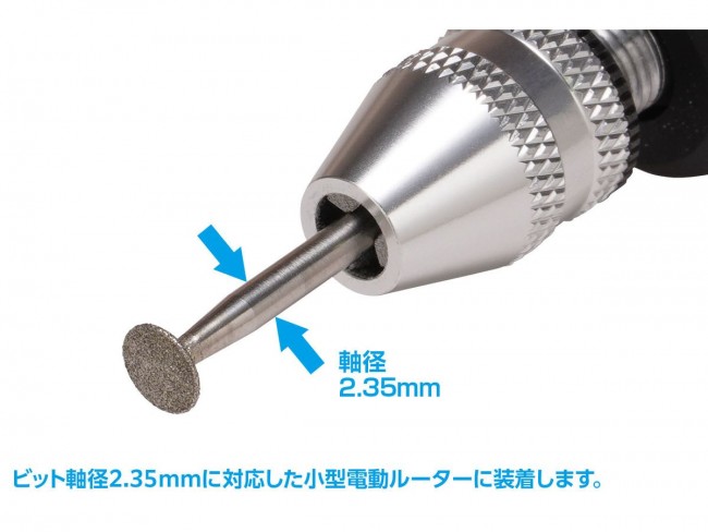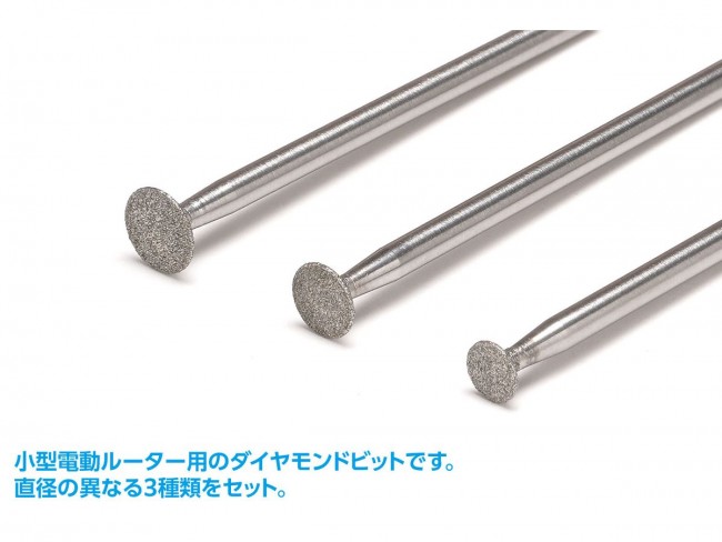 Diamond bit with a gently curved disc shape! ・Diamond bit designed for use with small electric routers for model making. ・Features a gently curved disc shape at the tip. ・Ideal for working in confined or hard-to-reach areas. ・#180 grit type, suitable for rough cutting plastics and resins. ・Set includes three sizes (large, medium, small) with different diameters. 【Important Notes】 ・This product's shape is not suitable for cutting parts. ・Before use, carefully read the electric router's instruction manual and ensure the bit is securely attached to prevent loosening. Diamond Bits for Electric Routers [Disc Type] 3-Piece Set ■Approximate Diameter Sizes: Large: approx. 6mm / Medium: approx. 5mm / Small: approx. 4mm ■Grit: #180 ■Shank Diameter: 2.35mm ■Product Code: HT-089 ※Images are of a prototype. Actual product may differ. Please note. ※Tools, materials, or parts other than the product shown in the illustrative photos are not included. (From the Wave website)