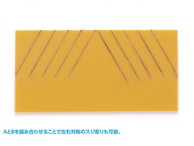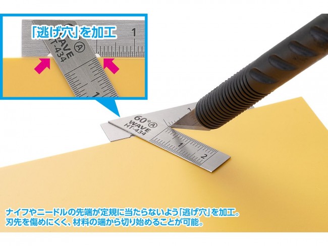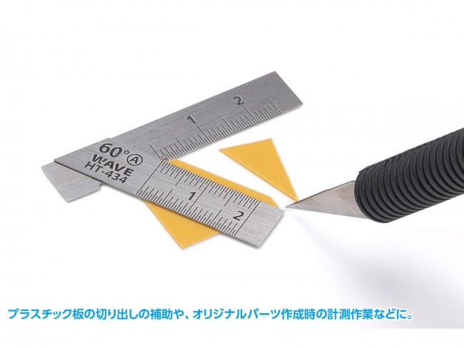 For cutting plastic sheets and scoring plastic models. Introducing the easy-to-handle short T-square! ・This T-square is convenient for assisting with cutting plastic sheets and measuring during original part creation. ・Includes two types of rulers (A/B) in the set for versatile use depending on the task. ・Its short, easy-to-handle design also makes it useful as a guide for scoring at a consistent angle while following the edge of a part. ・Thickness is 0.5mm, maintaining strength while ensuring a snug fit with parts. ・Features “escape holes” at intersections to prevent knife or needle tips from hitting the ruler during cutting. This minimizes damage to cutting tools and allows starting cuts from the edge of the material. ・The scale is created using etching engraving + ink filling. This specification ensures high visibility and resistance to fading. With 0.5mm increments, it enables more precise work. 【Caution】Please use the scale on this product as a reference only. It may not be suitable for measurements requiring strict precision. HG Stainless T-Ruler [Short Type] 2-Piece Set / 60° ■Product Body: Stainless Steel ■Product Code: HT-434 ※Images are of a development sample. Actual product may differ. Please note. ※Tools, materials, parts, etc., other than this product used in explanatory photos are not included. (From Wave Website)
