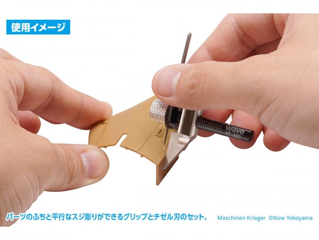 Enables chiseling parallel to the edge of the part! This set includes a precision chisel blade and grip for engraving lines parallel to the edge of plastic and resin parts. By engraving while placing the guide on the edge of the part, you can engrave lines parallel to the edge of the part. By adjusting the position of the guide, the distance from the edge to the engraving line can be freely changed. (The distance from the edge to the engraving line can be changed freely by adjusting the position of the guide (0 to 20 mm). The chisel is also useful for taking the edge of the engraving line for width filling work. A chisel blade specially designed for line engraving is included, allowing you to start work immediately. The ultra-fine 0.15 mm wide flat cutting edge enables sharp engraving with uniform groove width. By replacing the chisel blade with the HG Micro Chisel (sold separately), parallel lines of various line widths can be engraved. [Caution] This product is a cutting tool, so please handle with care. This product is designed for use with plastic. Do not use this product for hard materials such as metal parts. The blade and grip are for series use only and cannot be used in combination with other companies' products. The scale on the main unit should be used as a guide only. It may not be suitable for use when strict accuracy is required. Parallel line engraving grip for HG Micro Chisel Main unit size: approx. 48 x 48 x 12 (mm) *Chisel blade is not included. Accessories: Dedicated chisel blade (HG Micro Chisel blade width 0.15mm), hexagonal wrench Product code: HT-580 *Each part size is for reference only and may vary slightly. *The image is under development. They may differ from the actual product. Please understand. *Tools, materials, parts, etc. other than this product used in the photos for explanation are not included. (From Wave website)